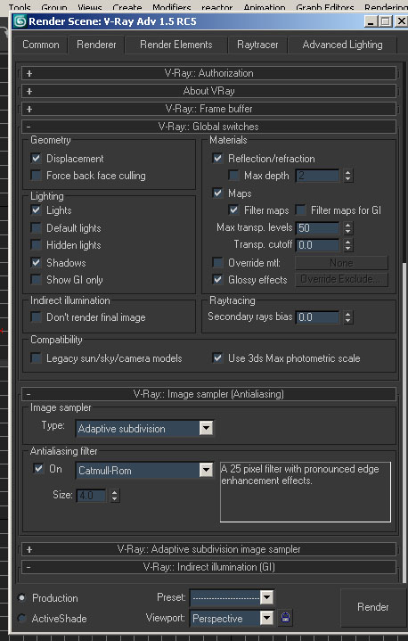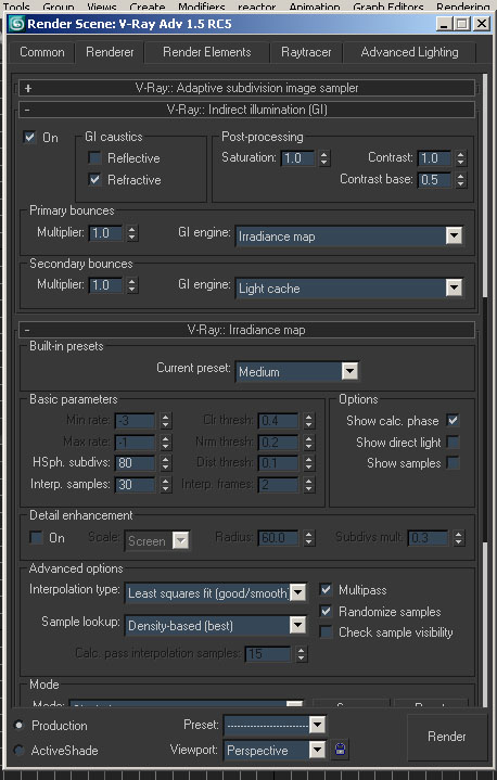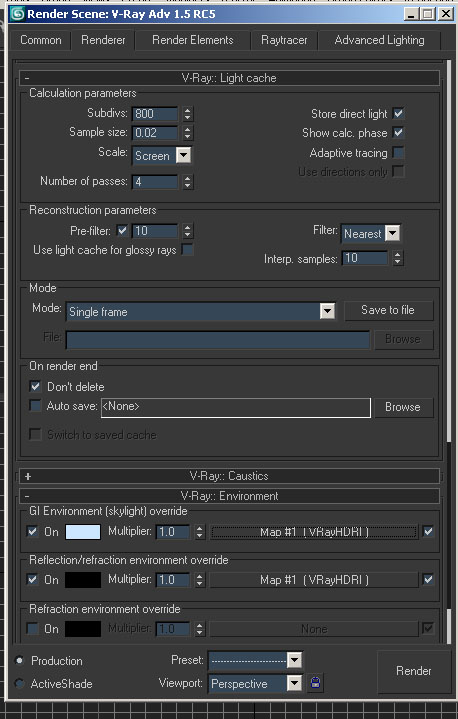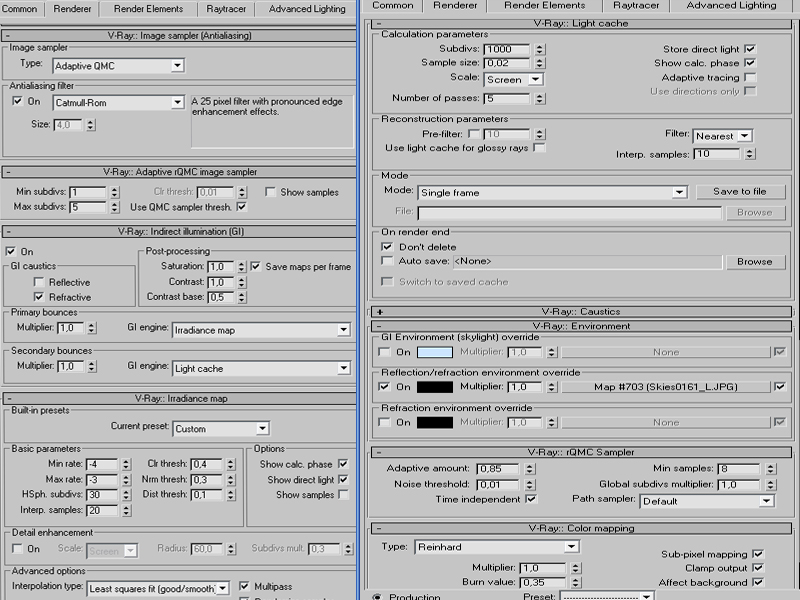 Hola, ahí te van unos parámetros que a mí me funcionan muy bien la mayoría de veces, si es para ensayo de render, bájale las subdivisiones en Light Cache, a 120, si es render final ponle entre 600 y 1200 dependiendo de brillos y cosas como agua, prede el prefilter.