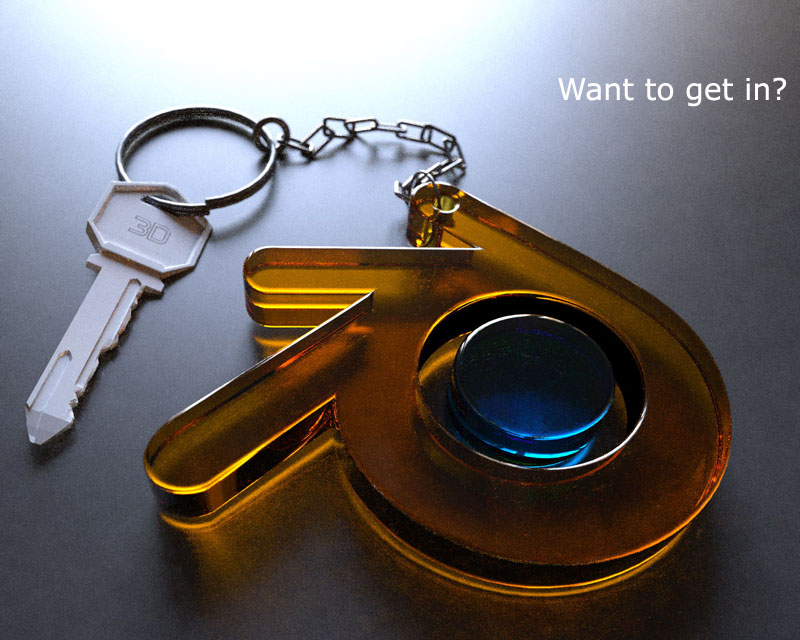 Con una llave algo más futurista (tipo llave de coche)en la que las letras 3d sean tipo neón y desprendan algo de luz y que el llavero reciba esa luz y alguna más de relleno dejando la esquina dónde está la llave un poco más oscura y el llavero más iluminado por la luz de relleno.