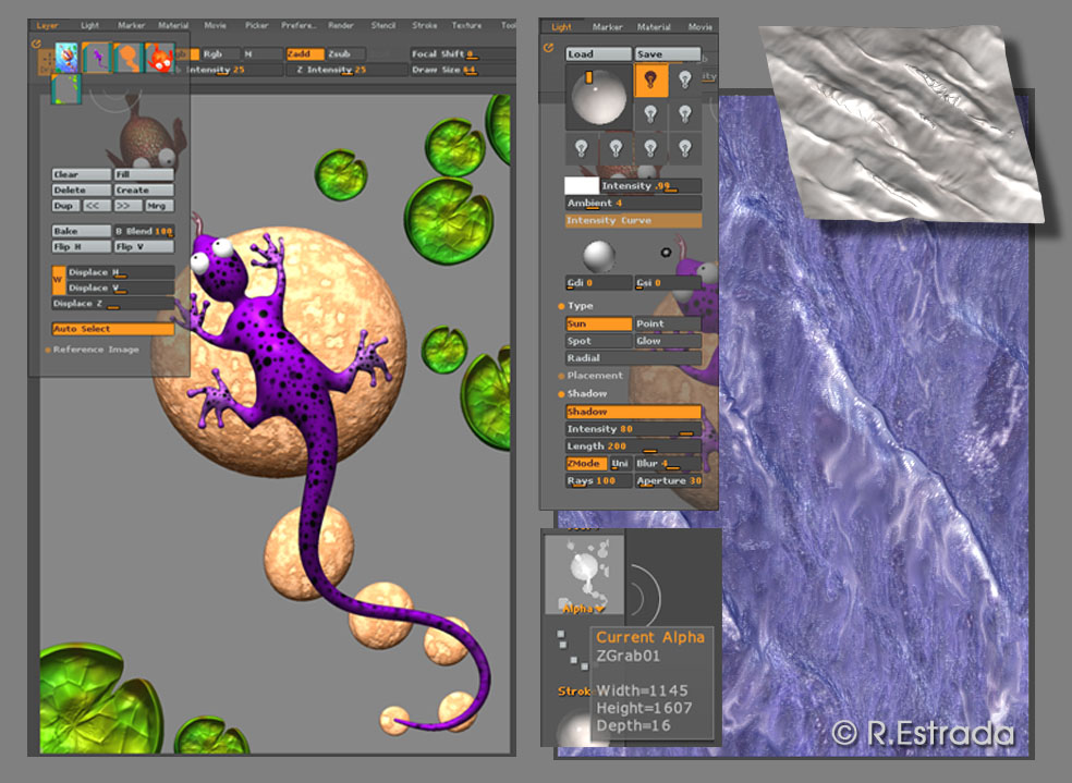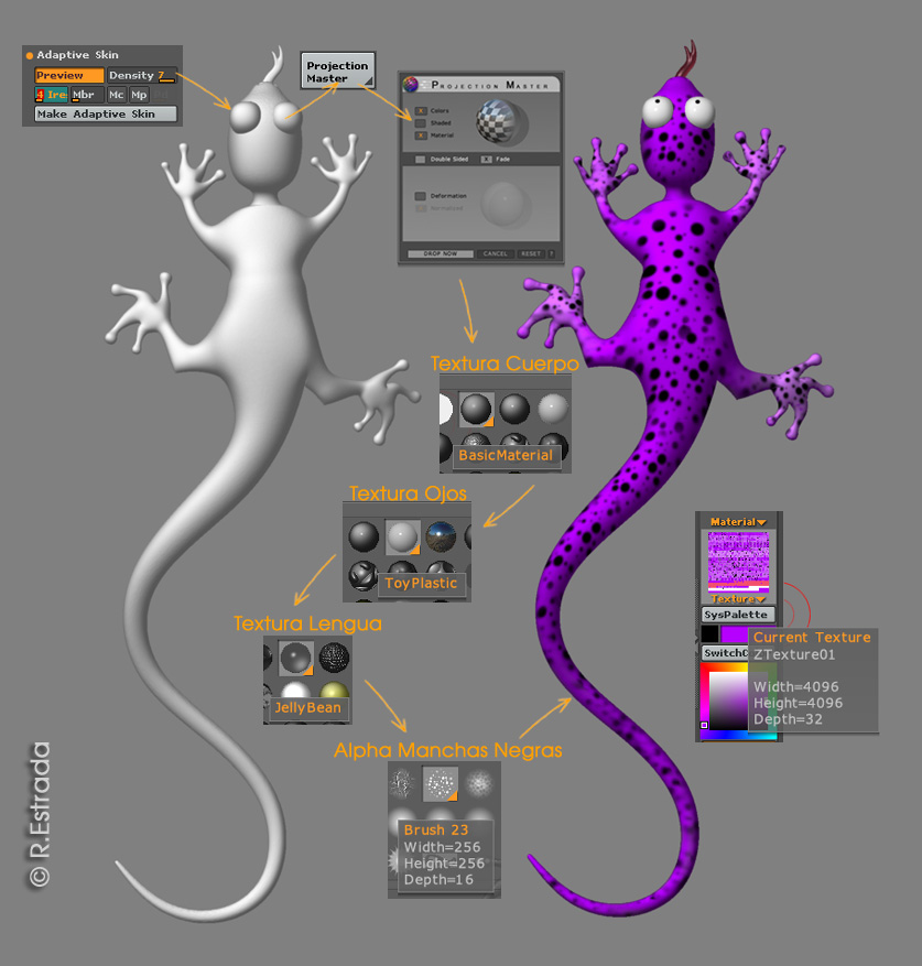 -El pez está hecho siguiendo lo mismos pasos que la salamandra, modelando las aletas y la cola con máscaras dibujadas sobre la piel, utilizando move, STD, Pinch y smooth. La roca y la hoja a partir de la sphere3d. La textura de la piedra es la mp085 del paterial pak modificada a mi gusto. La hoja esta modelada desde dentro de projectión master y desde fuera con move, STD, Pinch y smooth.