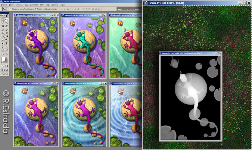 -En Photoshop hago selecciones de todos los elementos y los coloco encima del agua. Creo nuevas sombras, ajusto el brillo, el contraste, pruebo diferentes colores con niveles-tono/saturación y, utilizando el filtro water ripples, modifico el agua. Después, hago una selección en la esquina superior derecha y pego el fondo arenoso del arroyo, que ya tenía hecho con ZBrush de una ilustración anterior que coloqué en este foro: zbrushcentral - El amor. Suelo reutilizar cosas ya hechas anteriormente con ZBrush, modificando para no repetir.