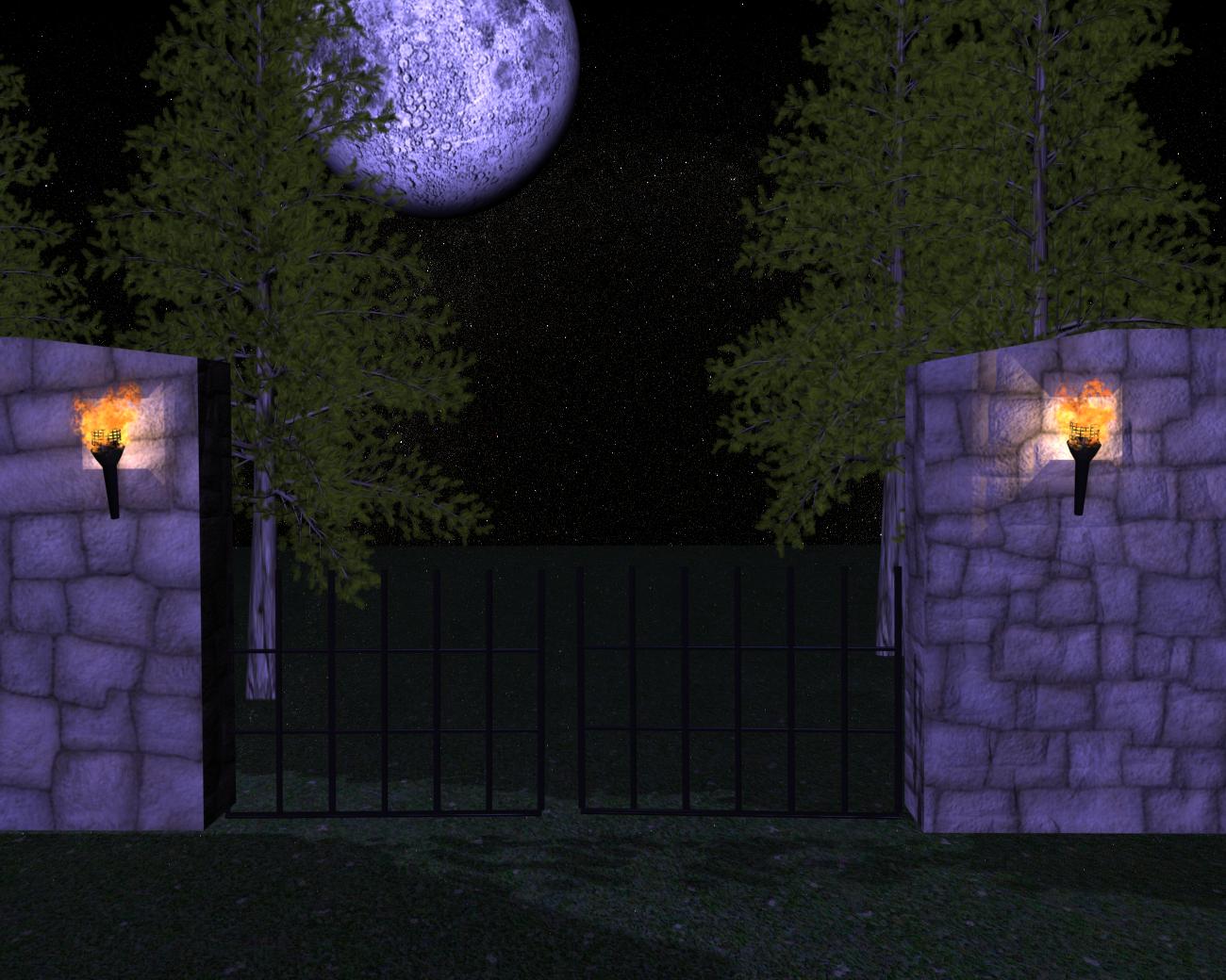 Lo mejor, la luna y el cielo estrellado. Lo peor, las paredes y las luces de las antorchas, miremos un poco, la textura de las paredes no tienen nada de relieve y los bordes de las paredes son rectos, la reja no tiene sombra y la base de los árboles se supone que están en una parte oscura y no se deberían ver y la luz ambiental, tal y como dice Shazam, tal vez para un vídeojuego, pero no te desanimes, trata de mejorar tu escena.