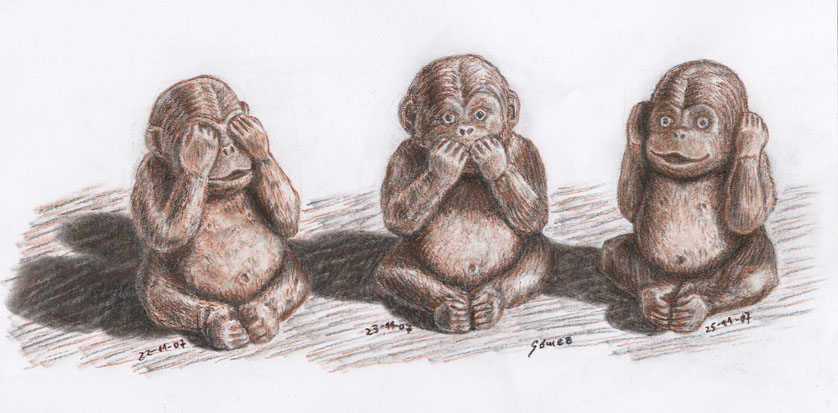Dejo el último donde me he salido un poco de la línea trazada, pero es que, estos monos sabios también me pedían que los dibujara añadiendo Trazos rojos, las herramientas son: carboncillo para encajar y proporcionar, lápiz conté negro y sanguina para detalles y goma para brillos y claros de la sombra en el suelo.