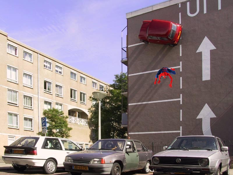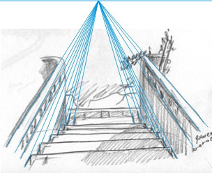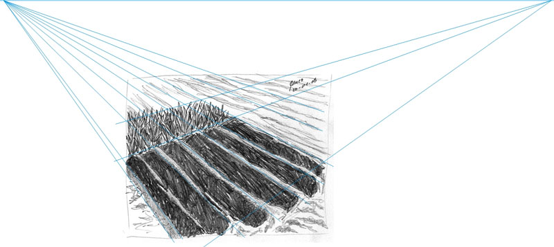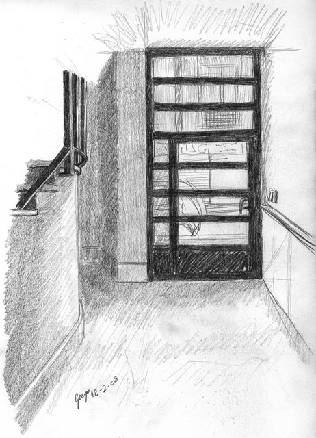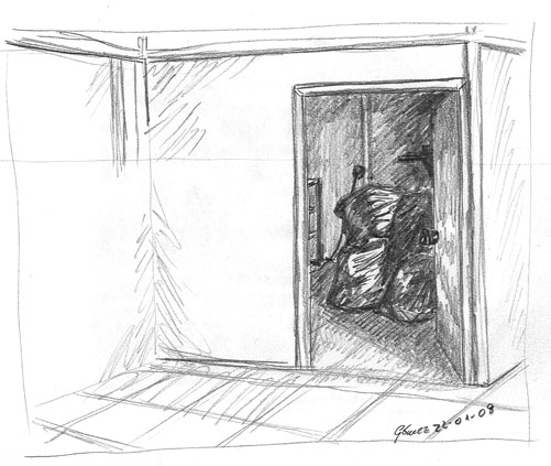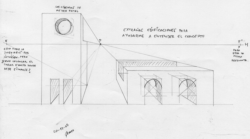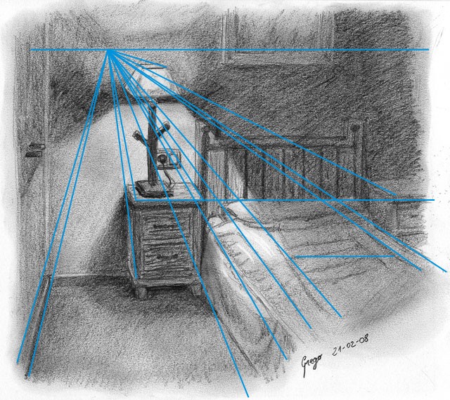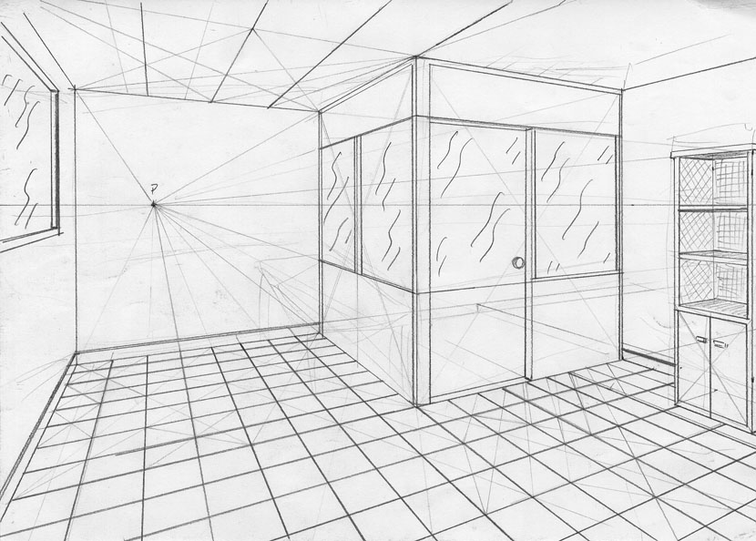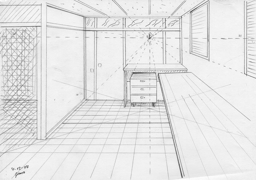 La misma oficina, pero del otro lado, dos puntos de fuga cercanos el uno del otro para exagerar la perspectiva y deformar la realidad.