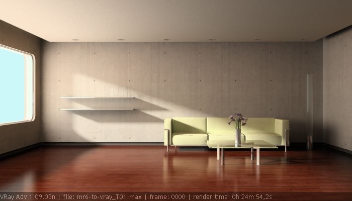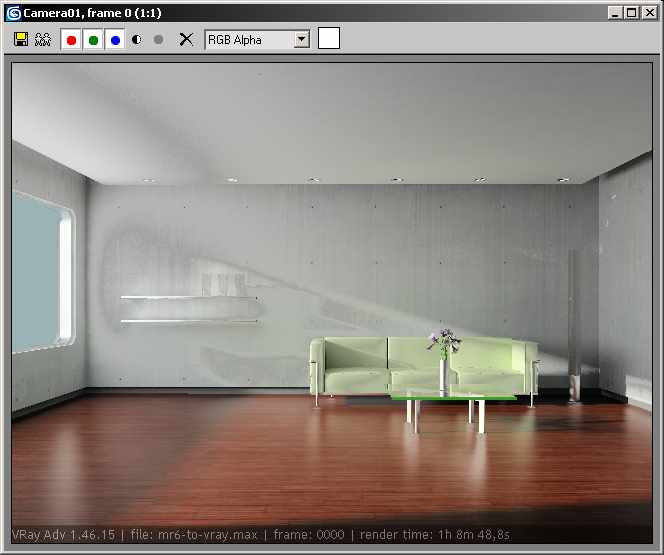 Me gustó más el último render, especialmente la luz en la ventana y el piso, por cierto, ¿Qué Vray le va al 3ds Max 6? ¿el Vray advance? Bajé tu escena Dideje, a probar. Se agradece.