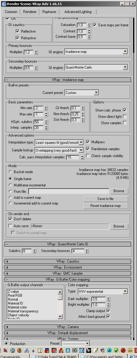 Hola Franquy, aquí van los parámetros de esa imagen. Por cierto, que se me olvidó ponerlo en el otro mensajes. Según me han dicho en el foro de Vray el Color Mapping influye en el render desde el principio y sí que varían mucho los tiempos, así que, yo estaba equivocado, aunque el manual no es claro en ese aspecto las pruebas que he vuelto a hacer sí que varían bastante los tiempos. Saludos.
