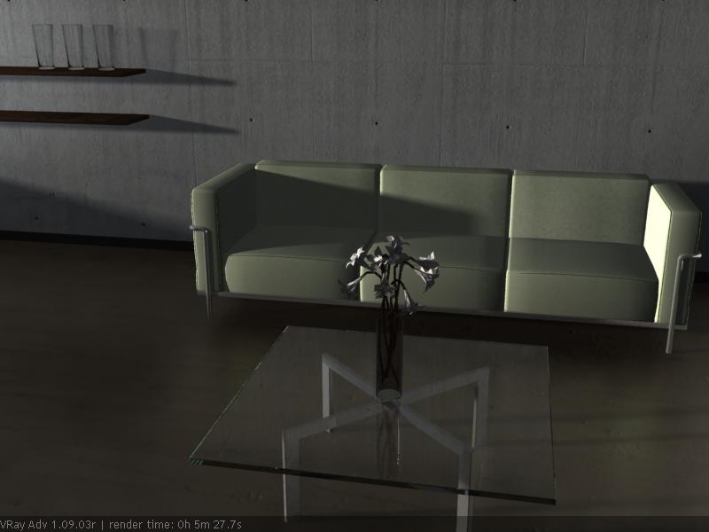 Hola Snopy bienvenido. Yo te recomiendo que hagas una búsqueda en todo el foro sobre Vray y vayas leyendo cosas y aprendiendo poco a poco, hay mucho material que mirar. De todas formas, aquí tienes una escena de Gonzalo configurada. Aquí va mi anterior prueba a más resolución y con un, antialiasing decente.