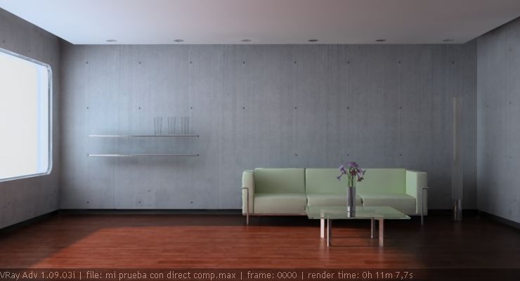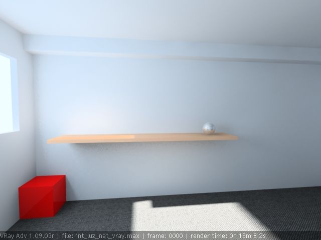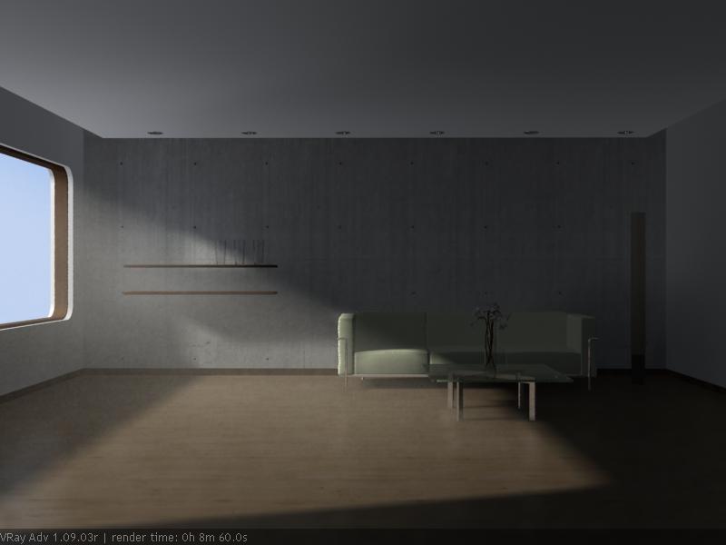 Hola a todos, llevo un mes leyendo el anterior mensaje de Dideje sobre iluminación interior y haciendo pruebas con Vray. Me he animado con la escena con la comenzastéis el mensaje (bueno, una adaptación personal) y no me convence mucho, sobre todo la apariencia granulada de las sombras. No sé si es por los samples de la Vray Shadow del sol o parámetros de calidad del irradiance o a.
