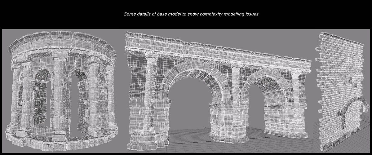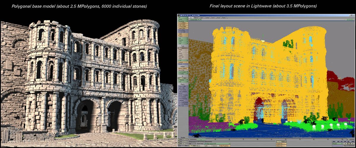 Aquí os dejo unas imágenes con mallas y demás que publique en CGtalk para que las tengáis. En cuanto a vuestras preguntas os diré que en realidad el LightWave se maneja muy bien con escenas y objetos complejos. Él modelado está echa por piezas en el modeler y luego mezcladas en el Layout, eso sí, en un ordenador con 1 Gb de RAM. En cuanto al método de modelado, las ventajas son el detalle que tiene el modelo, especialmente visible en las sombras y demás. Pero en realidad no creo que compensé llegar a este nivel. Es mejor mantener un nivel de detalle adecuado y trabajar más en el apartado de texturas. Es todo más manejable y al final el resultado es más limpio, aunque en este caso en particular el monumento real tiene un aspecto realmente irregular. Un saludo. Juan. González.