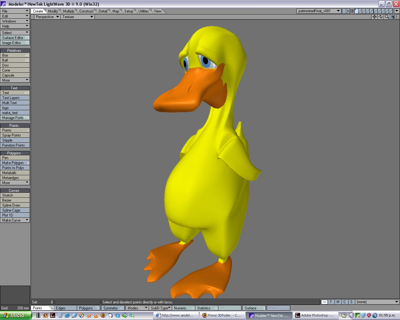 Postdata 2: según la imagen que adjunte al patito le falta hacerle la boca creo que es la parte más difícil de modelar para mí ya que, al usar multishift o smoothshift se me hace un lío bárbaro, sabrán de alguna técnica mejor o especial para hacer una boca de pato abierta?