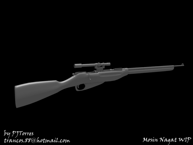 Con lo nuevo, si es un mosin nagat de 1891(se ve que te los conoces). Con lo de la base del rifle hay cosas que tengo que pulir, pero tiempo al tiempo, con lo que tuve difucultades es con el cerrojo (el recargador), por que en las fotografías que tengo no se ve muy bien, y puede que halla inventado algo. Y la mira telescópica, sí, es diseño mío, porque tenía dos referencias del mosin nagat de 1981, uno, tenía la mira cómo tú dices, en la parte de atrás y el tubo más corto, y la otra tiene el agarre donde lo tengo puesto y de tubo largo, ha si que lo que he hecho es coger el agarre de la segunda referencia y el tubo es lo que me he inventado, por que no me gustaban ninguna de los dos.