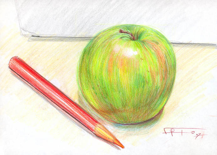 Es acertada la sugerencia de agrupar o exponer las ilustraciones en una sola página. Esta manzana con lápiz están realizados del natural, colocando ambos elementos en mí mesa al lado del teclado.