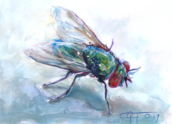Por ejemplo, la de la mosca no tiene casi nada que ver con la original, hasta goma de pegar escolar mezclada con tinta China le apliqué de ahí esas texturas del fondo transparentes, me place mucho experimentar con materiales.