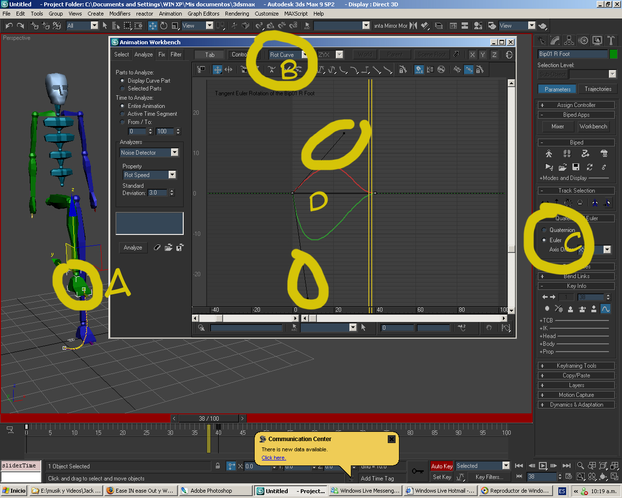 En la parte: A = obviamente selecciono en objeto que quiero aplicar curvas editables en el workbench. B = cambiamos el tipo de curva, en esa zona salen varios tipos de curvas que tiene el biped, tanto de rotación como de posición.