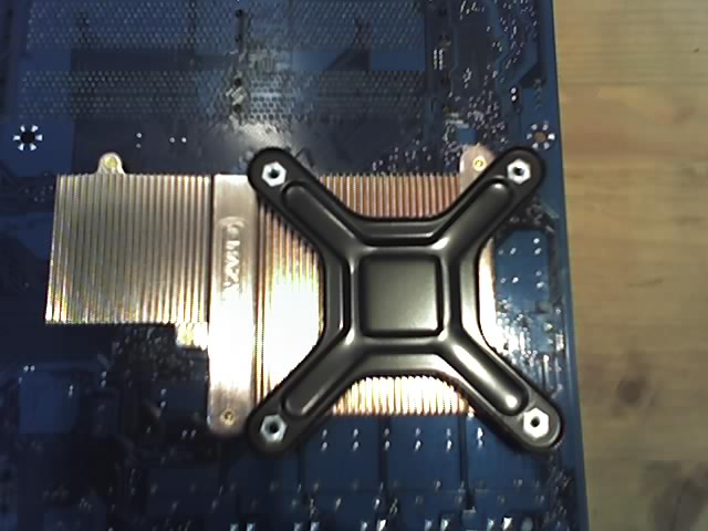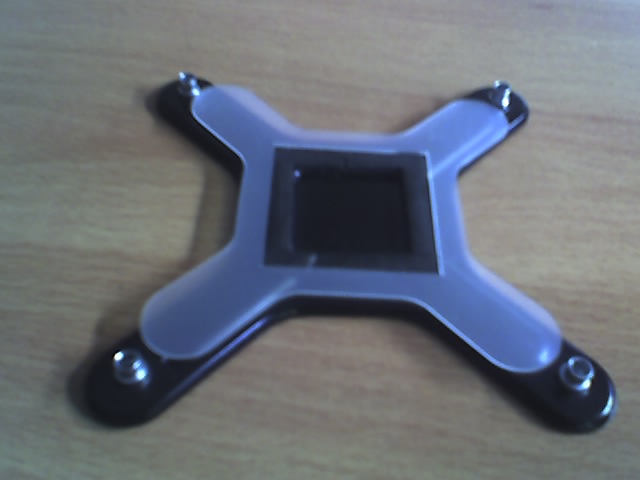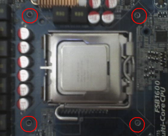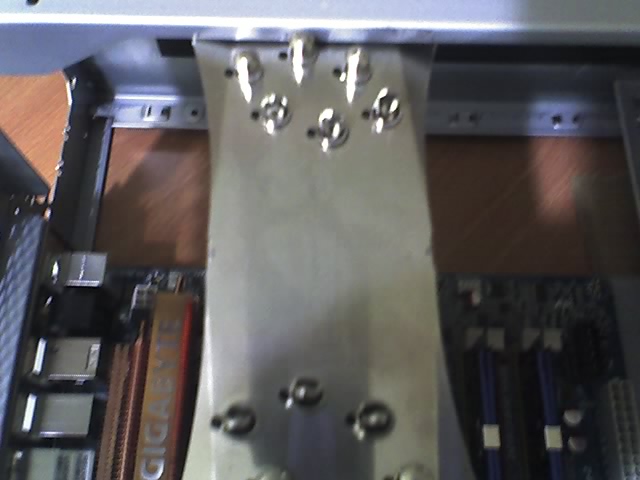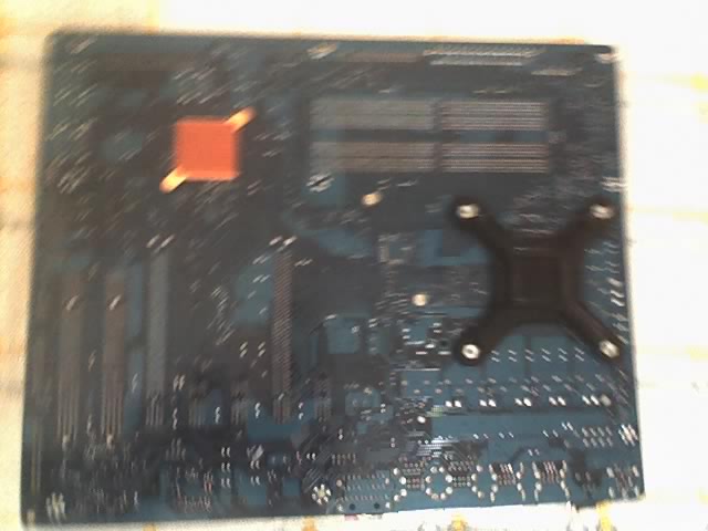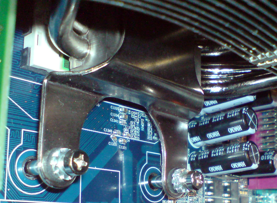 Las soluciones de los manitas para anclar el disipador sin quitar el crazy col son variadas: ponerle unos tornillos más largos, usar tuercas con arandela, cortar las esquinas del Backplate: placa Gigabyte p35 dq6 y disipador micro.
