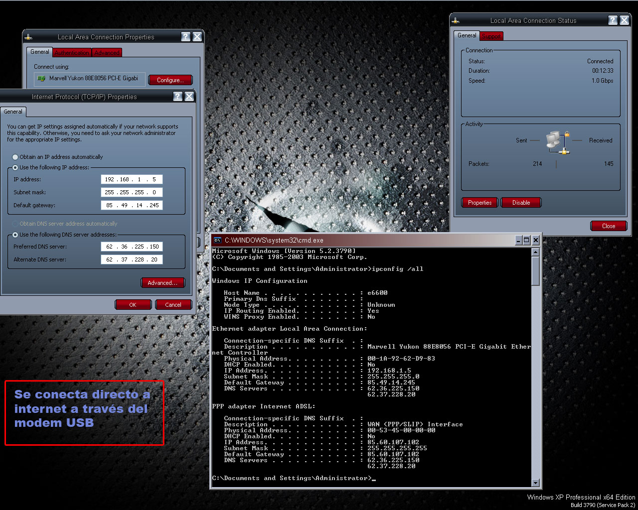 Bueno, pues resulta que la semana pasada hice un formateo a un PC que se conecta a internet directamente a través de un módem USB, hasta ese momento todo iba perfecto, pero ahora me resulta imposible acceder a internet desde los otros PC, lo importante, es que pueda hacerlo solo desde otro, el resto no me interesa.