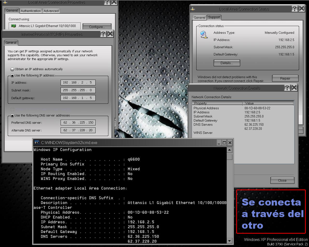 Nada, ¿cómo puedes ver he puesto la IP 192.168.1.5 al que se conecta directamente a internet en las propiedades tpc/ip de la conexión de área local, y al pollo le he puesto 192.168.2.5, las DNS de ambos son las de que mi proveedor me da, la puerta de enlace he probado a poner en el pollo la que me da mi ISP, y también la IP que tiene la red de área local del que se conecta a través del módem y nada, ahora ni siquiera me va la compartición de carpetas.