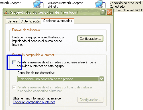 Esto no debería hacer falta, pero si lo anterior no funciona, prueba a marcar esta opción en el PC que tiene el módem. Esta en panel de control, conexiones de red, la tarjeta de red, propiedaes, ficha avanzadas.