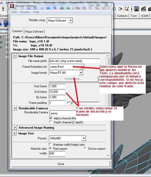 Aquí en la imagen tienes los parámetros que tienes que tocar. Y para lanzar el render, con el modo de menú rendering seleccionado selecciona render> Batch render.