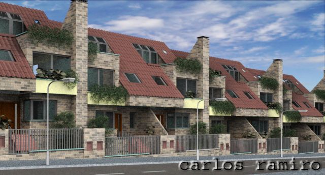 Hola. Unos chalets adosados que acabo de terminar. 3ds Max más ray. Necesito consejos, llevo varios días trabajado con la imagen y ya no le saco nada más. Un saludo.