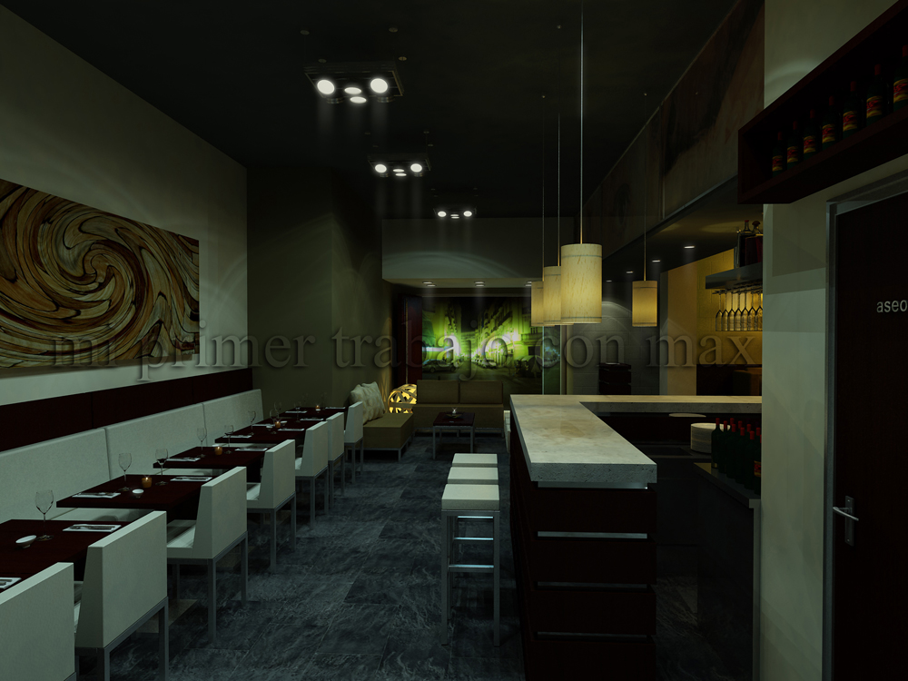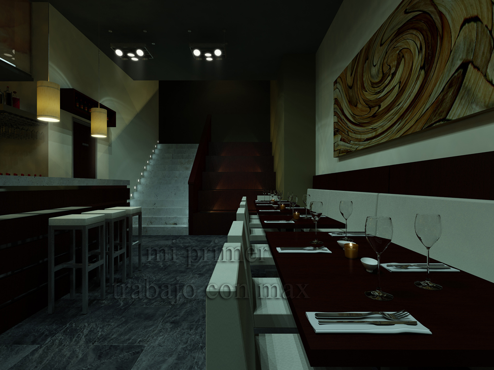No está nada mal para ser el primero. ¿lo has hecho por hobby o trabajas diseñando bares y restaurantes? Te lo pregunto porque yo sí, y me parece que este restaurante no te ha quedado nada mal. Un poco oscura la zona de las mesas donde se va a comer o cenar, necesitaría más luz, pero está muy bien.