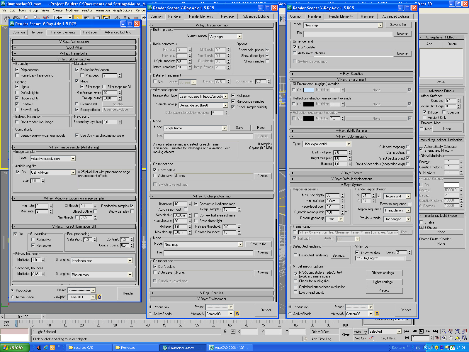 No, pero me base en los tutoriales de iluminación de un interior de Dideje. Igual sé que es harto tiempo, especialmente para una escena casi sin materiales, pero quería experimentar un poco con los seteos. (entendo que si cambio los seteos predeterminados de Irradiance Map a medium, por ejemplo, así como la cantidad de muestras, los tiempos son más adecuados). Saludos.