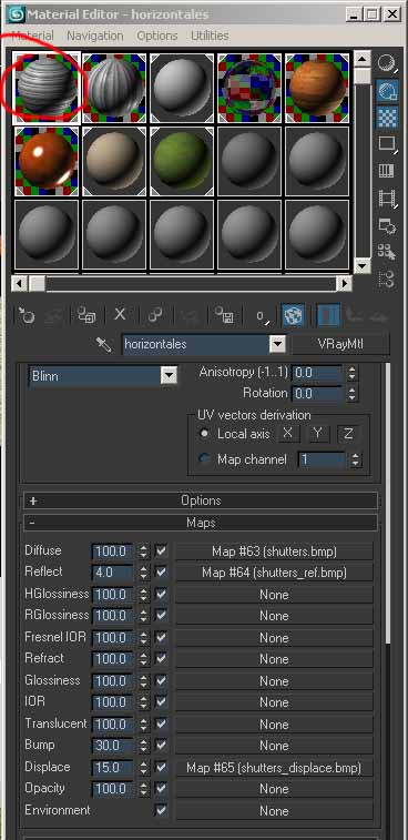 Bueno lo que veo es que está mal colocado el material del Diffuse shutters. Al parecer no tiene uvwmap, ya que se está tiliando, además fíjate el orden al parecer está editado y por último coloca el uvwmap. Pero eso es otra cuestión ya que el error es que colocaste un material de portón de chapa de Garage y al no tener gran definición de seteo tiende a tilearce, coloca un material en el Diffuse de chapa zincada, ahí no es necesario que uses uvwmap, no un portón de chapa de zinc y luego si su displace que el que colocas está bien, pero fíjate siempre la escala.