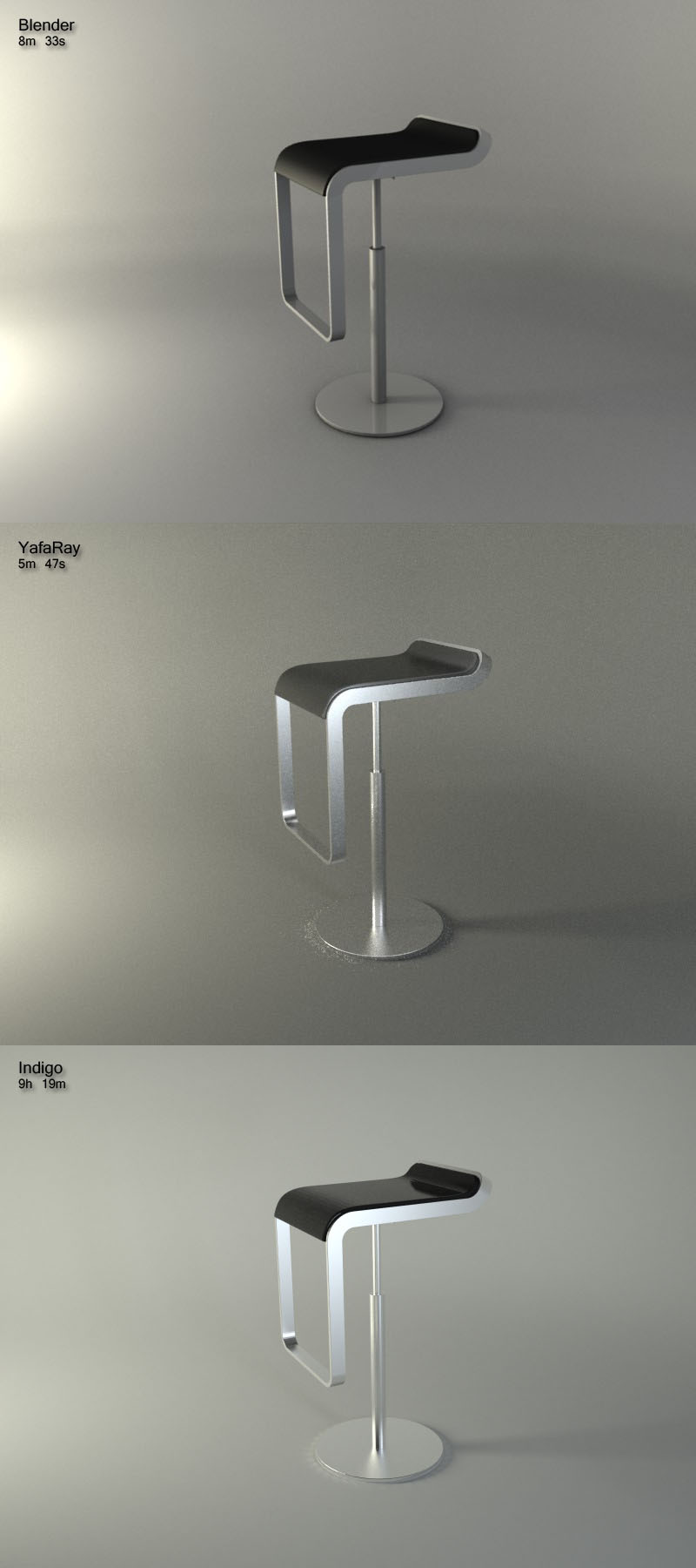 Par a mi interminable proyecto final de Carrera, hice algo parecido, comparativas de tiempos de render de unos muebles, con el motor de render interno, Indigo, y Yafray (gracias al maestro chronoh, que es un fiera con este motor), y salvo por la ausencia de Glossy reflections (a no ser que lo emules con bumps, o trastes en el xml) me quedo con este último, pero eso, porque tengo un setup que me hizo chronoh, muy optimizado. Un saludo.