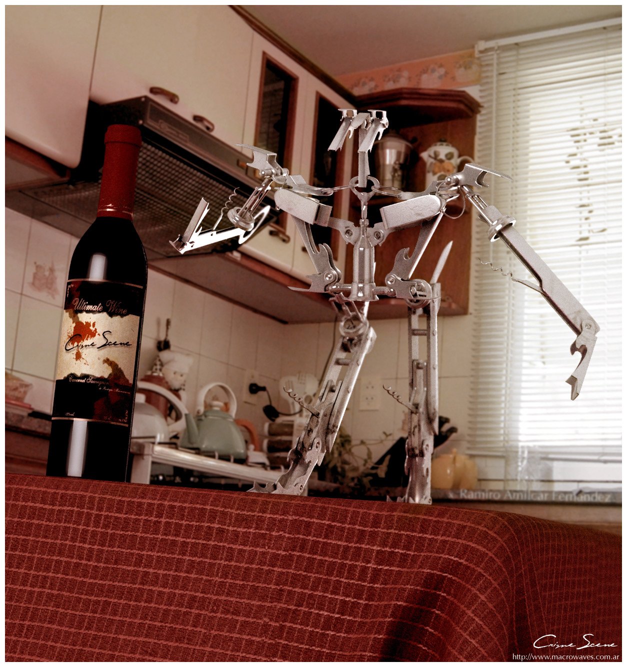 Hola amigos, en esta oportunidad publico un trabajo terminado al menos en su primera instancia que es lo conceptual. Luego de ver la película de Transformers, me di cuenta que los sacacorchos de botellas de vino tienen formas y posiciones como si fueran pequeños Transformers así que, imagine que sucedería con un robot compuesto con estas piezas y que amenace a los vinos que lo rodean, así que, llegue a este resultado.