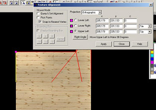 Manera (para que se vea bien) ponemos una vista en planta, seleccionamos el suelo, y le damos a, botón derecho? texture aligment. Entonces damos a pik point (seleccionar puntos) y Snap todo nearest (ajustar al más cercano), y seleccionaremos las esquinas inferior izquierda, inferior derecha y superior izquierda de dónde ira la textura. Para que no haya problemas con las triangulaciones de la textura las dos opciones de las casilla de la derecha del cuadro estarán en tile.