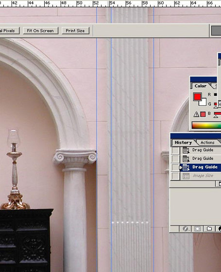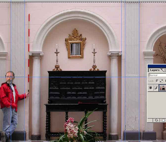 Primero ponemos una regleta horizontal a la altura del punto de vista desde dónde se ha sacado la fotografía. Sacamos unas reglas verticales (pinchando en las regletas del Adobe Photoshop y arrastrándolas hacia la fotografía) y las colocamos en las verticales ajustandos en el punto que estas cortan a la horizontal que hemos sacado en este caso la deformación es poca en otras ocasiones el alzado estará más fugado.