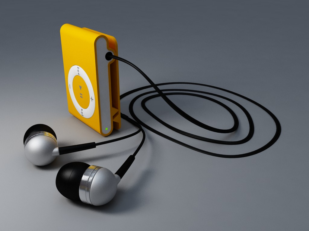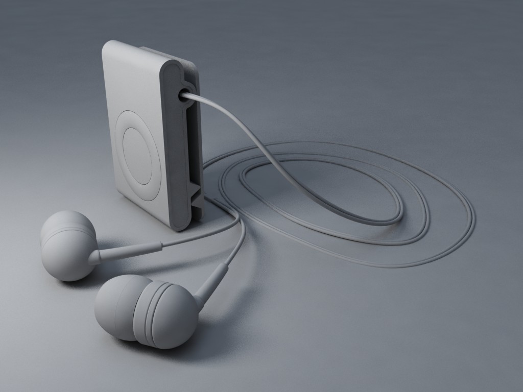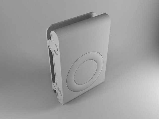 Qué bien que les gustó el mono, ese lo hice ya para cerrar el programa y apagar. Carlbat que bien que vallas a modelar el shufle así podremos comparar y ver las distintas formas de en que cada uno lo modelamos y así veo que cosas no realicé de la mejor manera. Ah por cierto, sobre la rueda si esta curva, solo que no se alcanza a notar por el ángulo que tiene la luz, pongo una imagen con la luz a un lado para que se note mejor. Bueno por lo pronto ya le puse el mapeado a los auriculares, ah y ya hice el Jack, me fijé y el del IPod está más fácil así que, termine haciendo ese, aunque de cualquier forma los auriculares no son tampoco los originales y, aún falta cambiar el cable por uno más largo. Hice unos pequeños ajustes y saque otro render, creo que el material ya luce un poco más convincente.