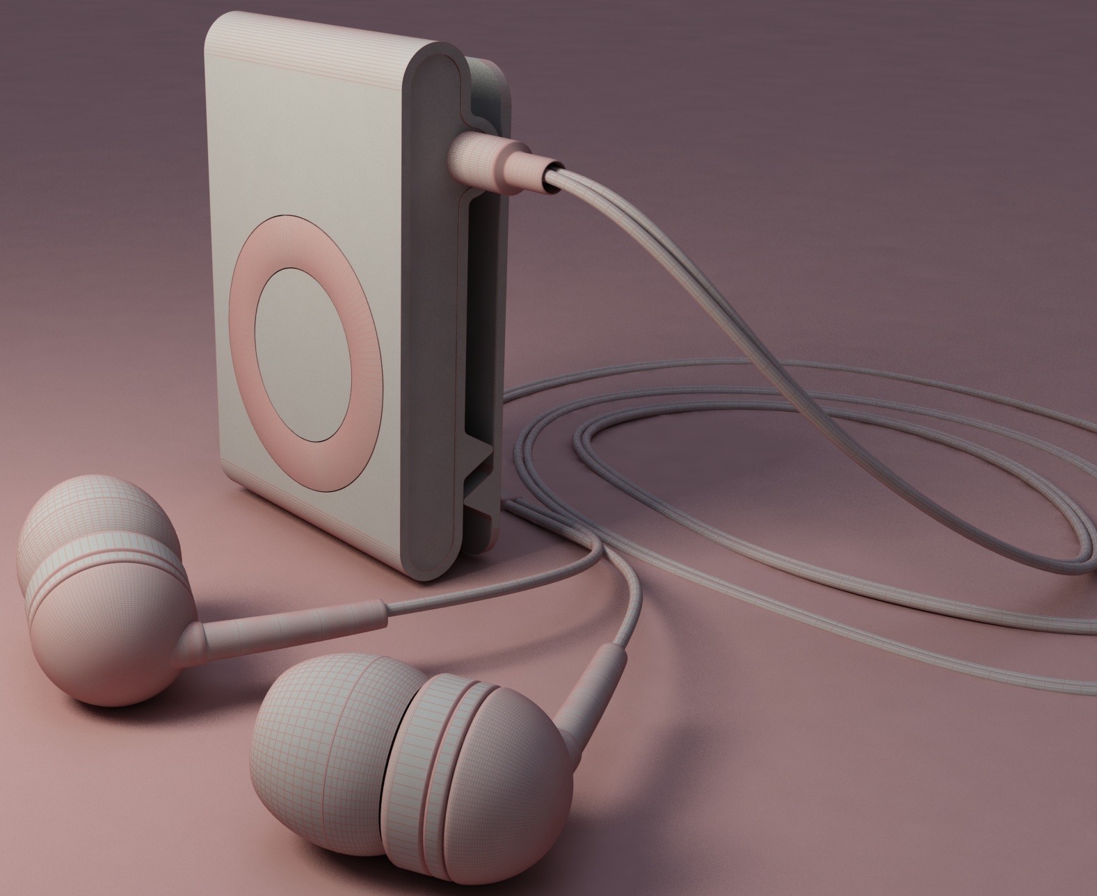 Bueno yo creo hasta aquí le voy a dejar por el momento con este proyecto, ayer tuve la idea de transformar el IPod en una mezcla entre IPod y tornamesa, todo lucia genial en mí mente, pero cuando comencé a hacerlo me di cuenta que todavía me falta seguir leyendo mucho más por que estoy limitadisimo a puro lathing y extrusiones. Pör último dejo una imagen de la malla en donde se puede apreciar la pésima distribución del poligonaje y donde saltan a la vista demás errores como el cable metiéndose en el plano.