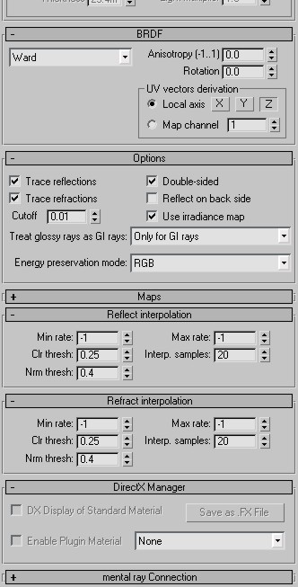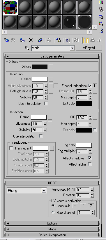 Los parámetros del material son, la reflexión a tope de blanco, (255,255,255), el highlight glossiness y el Reflex glossiness están a 1, sin Fresnel reflection ni nada parecido.