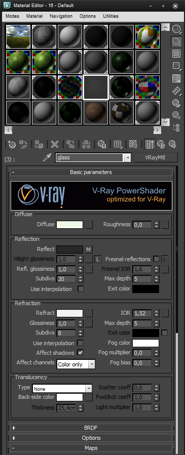 respuesta de idplano : la configuración que uso generalmente es poner en los reflejos un mapa fallof, activar perpendicular/paralelo, y en las refracción un color todo blanco con un índice de IOR de 1.52. Después para darle el verde en el espesor utilizo un color verde en Fog color, básicamente eso.