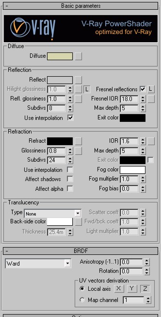 respuesta de Ricardo : ahora sí que te podemos ayudar. Debes cambiar el fallof a Fresnel o quitarlo y activar la casilla Fresnel reflections, cambiar el color de reflect a blanco, para tintarlo es suficiente con el Fog color y jugar algo con el Fog multiplier, el Diffuse pásalo a negro y muéstranos cómo te queda. Un saludo.