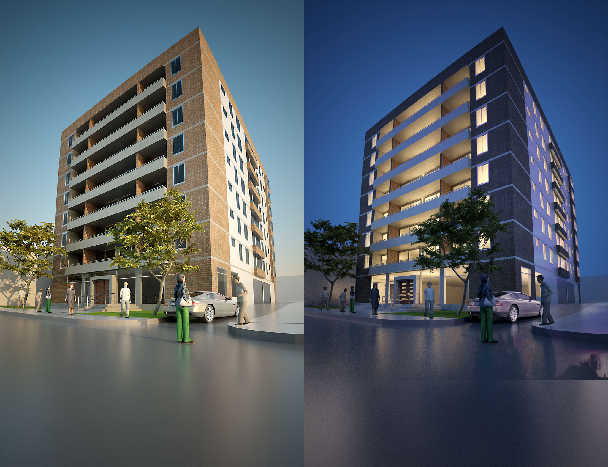 Para la nocturana utilice 4 vraylights espfericas por el contorno frontal y lateral de cada piso, estuve renderizando varias horas, renderizo con un Pentium Dual Core de 3 Ghz y 1 Gb de Ram, no sé si aumentar el Ram hará que mi render termine antes por eso aún no invierto en eso.