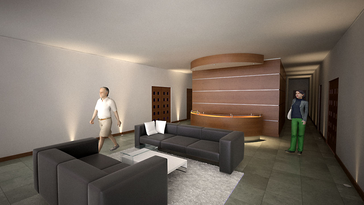 Gracias por sus comentarios, les muestro ahora el lobby del edificio, me pasaron la pura planta ya que no tenían muy clara las terminaciones, de lo que me imaginaba que podía ser el lobby realice este render.
