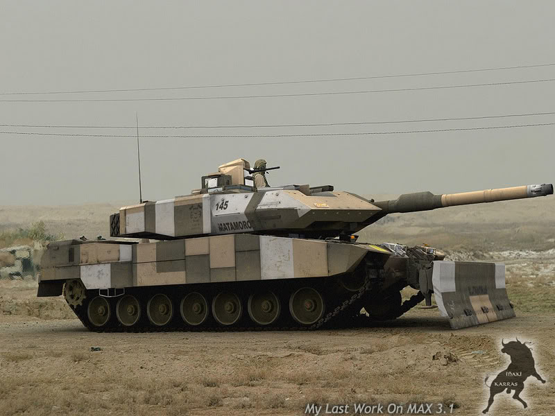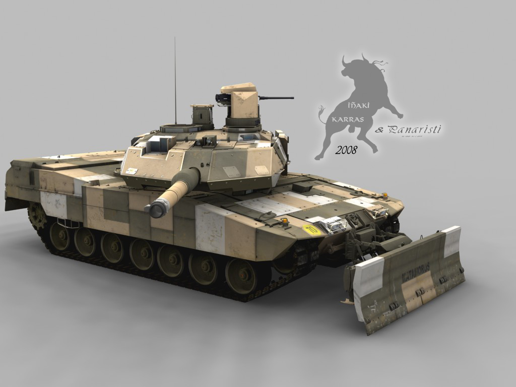 La torretilla por control remoto la ha modelado panaristi en Cinema 4D, el resto es de mi cosecha. Éste tanque no existe, la versiónb existente del PSO son 6 prototipos alemanes con éste mismo esquema, pero sobre Leopard 2a5 y éste está basado en una torre y chasis de Leopard 2E, pero con el cañón del a5 y a4 (el corto), los de verdad de Melilla son Leopard 2a4, pero podrían ser upgradeados a éste nivel.