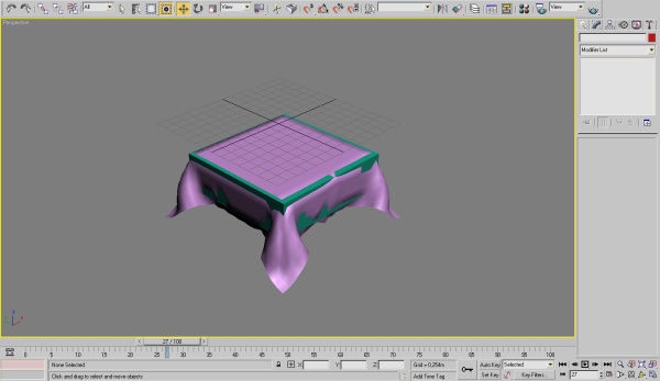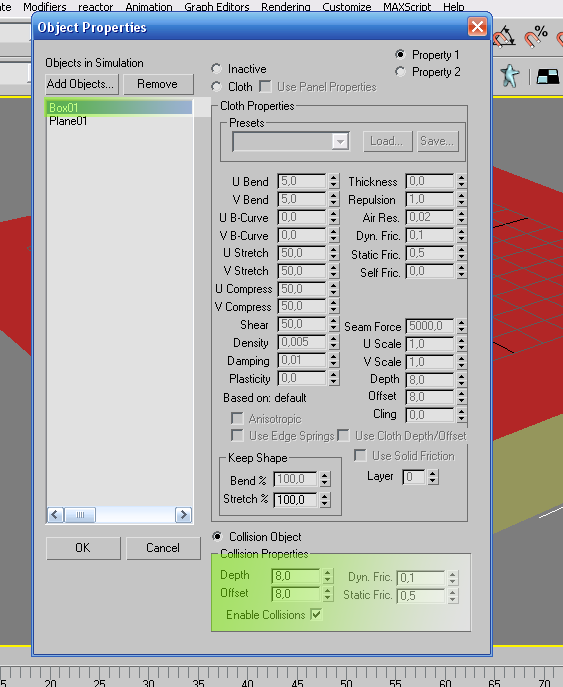 Estoy usando exactamente los mismos parámetros indicados en el video, pero aun así se cruza, probé subiendo el número de segmentos a 100 por 100 y ya no se cruza con la caja, pero ahora queda muy cuadrada la tela.