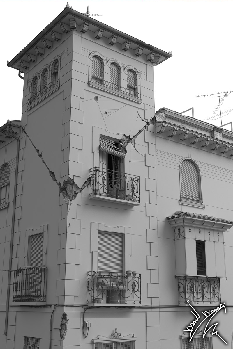 Sobre las grietas, debo decir que mi intención no era reflejar la grieta perfecta, se me ocurrió darle ese corte como un simbolismo, en un principio el edificio iba a aparecer en perfecto estado, pero decidí en último momento darle un golpe emotivo al trabajo con esa grieta.