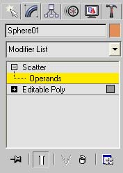 Bien hasta aquí supongo que, sería lo que hacías, para decirle al max en qué zona concreta quieres que distribuya las esferas tienes que ir al menú modify y dentro de scatter pulsar el + y elegir operandos (imagen_02).