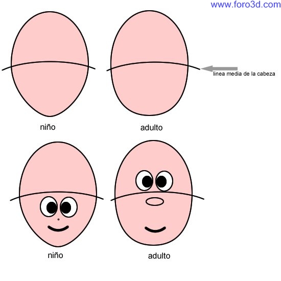 Mientras más joven sea nuestro personaje, los elementos se distribuirán por debajo de la línea media de la cabeza, y de ser posible con los elementos que conforman la cara más juntos entre sí, también posen un mentón más angosto.
