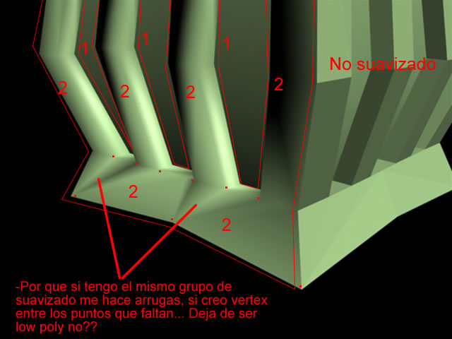 Hola, tengo problemas con los grupos de suavizado, lo expongo en la imagen, el caso es que tengo polígonos con 7 u 8 lados, y al suavizarlo con los demás me hace pliegues raros, y no sé cómo solucionarlo que no puedo hacer es hacer un montón de vertex de punto a punto por que, si no sería Low-poly ¿no? Como se afronta esto?