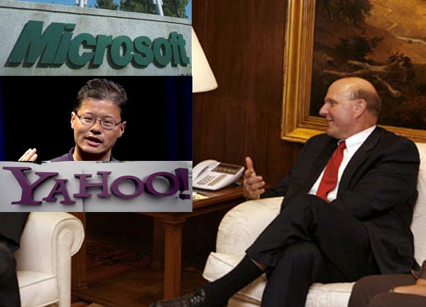 El consejero delegado de Microsoft, Steve Ballmer, y el director ejecitivo de Yahoo. Jerry yang, junto a los logos de sus compañías