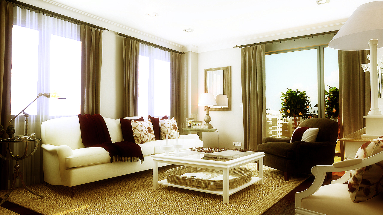 Para mí gusto, tiene mucha luz, lo cual no da sensación de habitabilidad, luego los naranjos de la terraza igual deberías desenfocarlos un poco incluso quitarlos y poner una barandilla en la misma, por último en la cortina de la derecha te sobran anillas o te falta cortina, corrigiendo un poco la luz te puede quedar muy bien la escena.