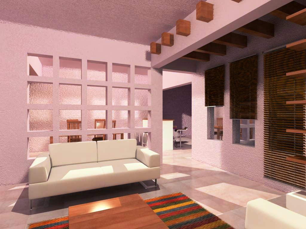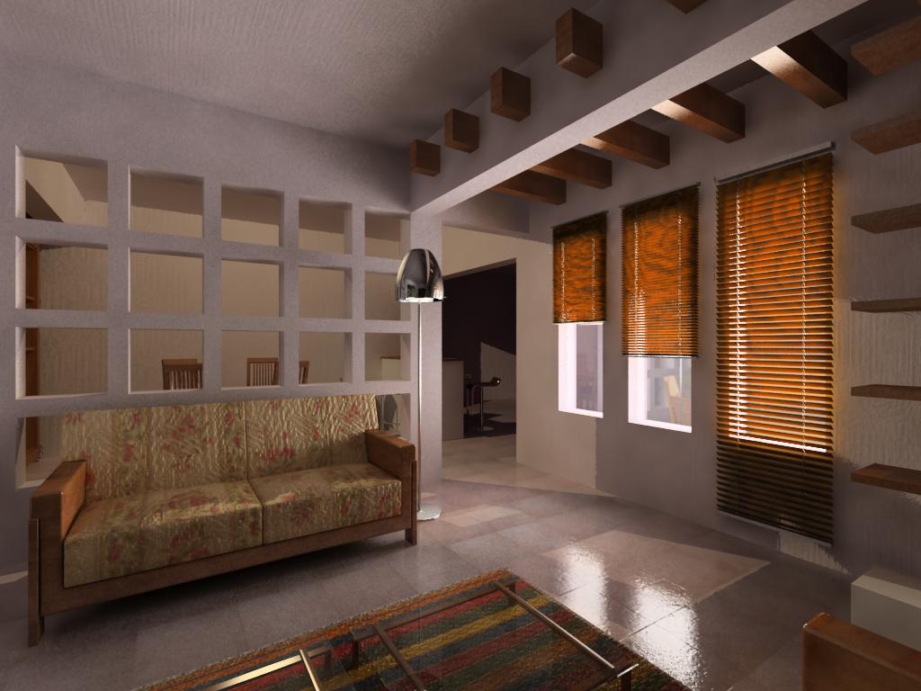 Hola, la textura de las paredes parecen cristal. La viguetas de madera parecen demasiado grandes, me gustan las persianas y el colorido de la alfombra. Un saludo.