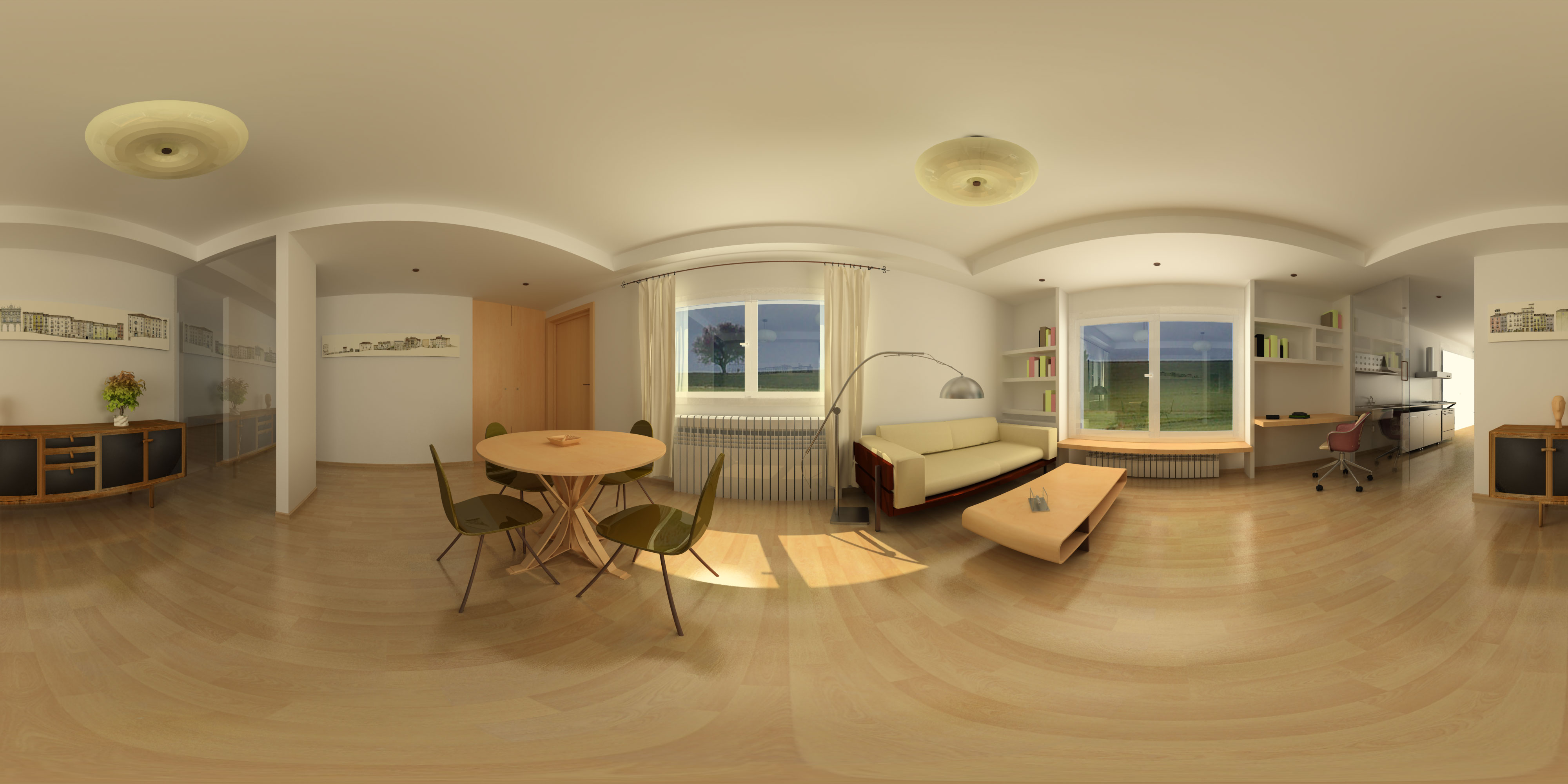 Si, el Panorame exporter de max de max actúa como un cubo: hace seis renders, de cada cara del cubo. Es ideal para interiores, porque hace un render del techo, del suelo y de las 4 paredes, entonces muestra la habitación desde el centro. Claro, lo que yo pregunto es al revés: para exteriores. Imaginaos un edificio, el edificio queda en el centro y nos vamos moviendo para verlo desde distintos puntos de vista, algo parecido a AutoCAD dwf 3d, pero renderizado.