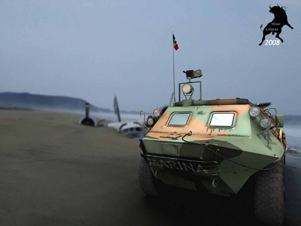 Felicitaciones amigo, la primera integración me gusta mucho, pero te critico un par de cosas, primero veo un poco saturada la carrocería (no sé si se le llama así en este tipo de vehículo) teniendo en cuenta un cielo tan nublado, y segundo pienso que debería hundirse más en el terreno para que de mejor sensación de peso.