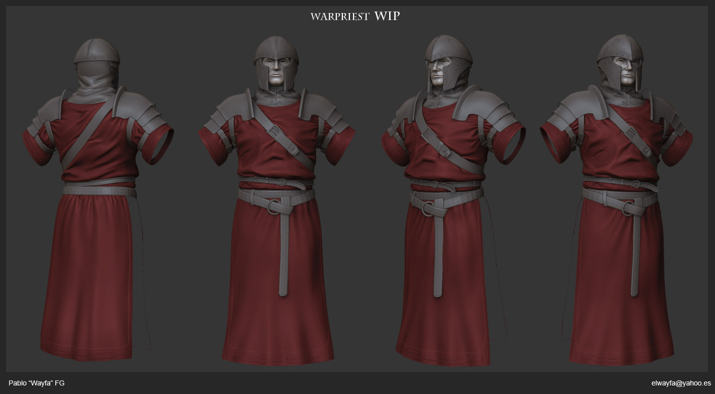 A mí la verdad que me parece que te está quedando genial. Me gustan mucho las filigranas que has añadido en los bordes de la túnica y cómo se integra ésta con los cinturones y demás correajes.