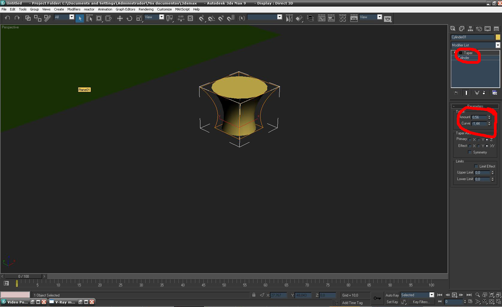 2-. A ese cilindro le aplicamos un modificador taper para que quede de la siguiente forma: